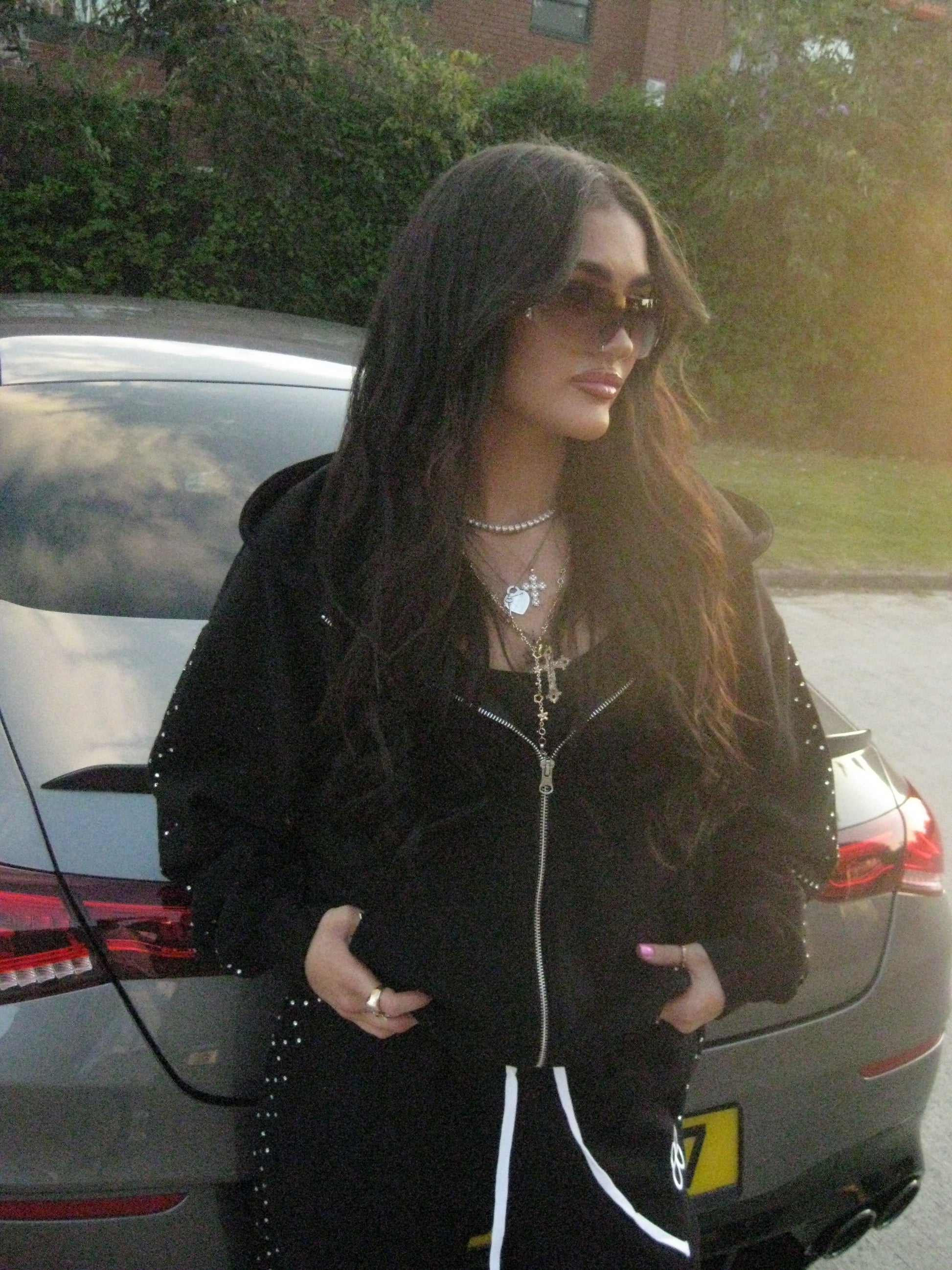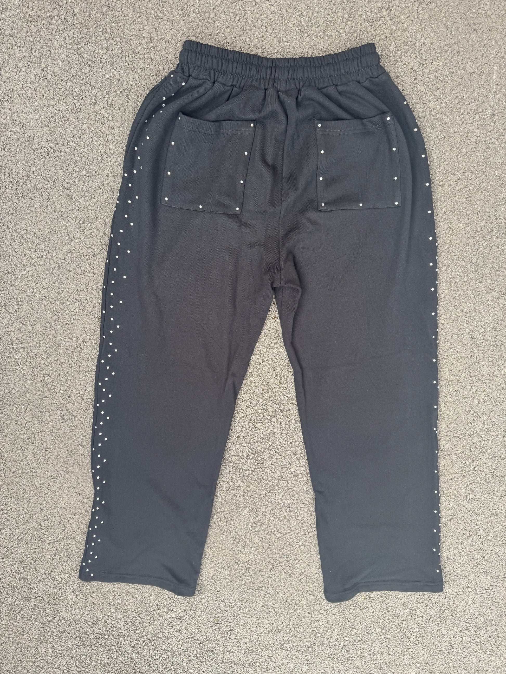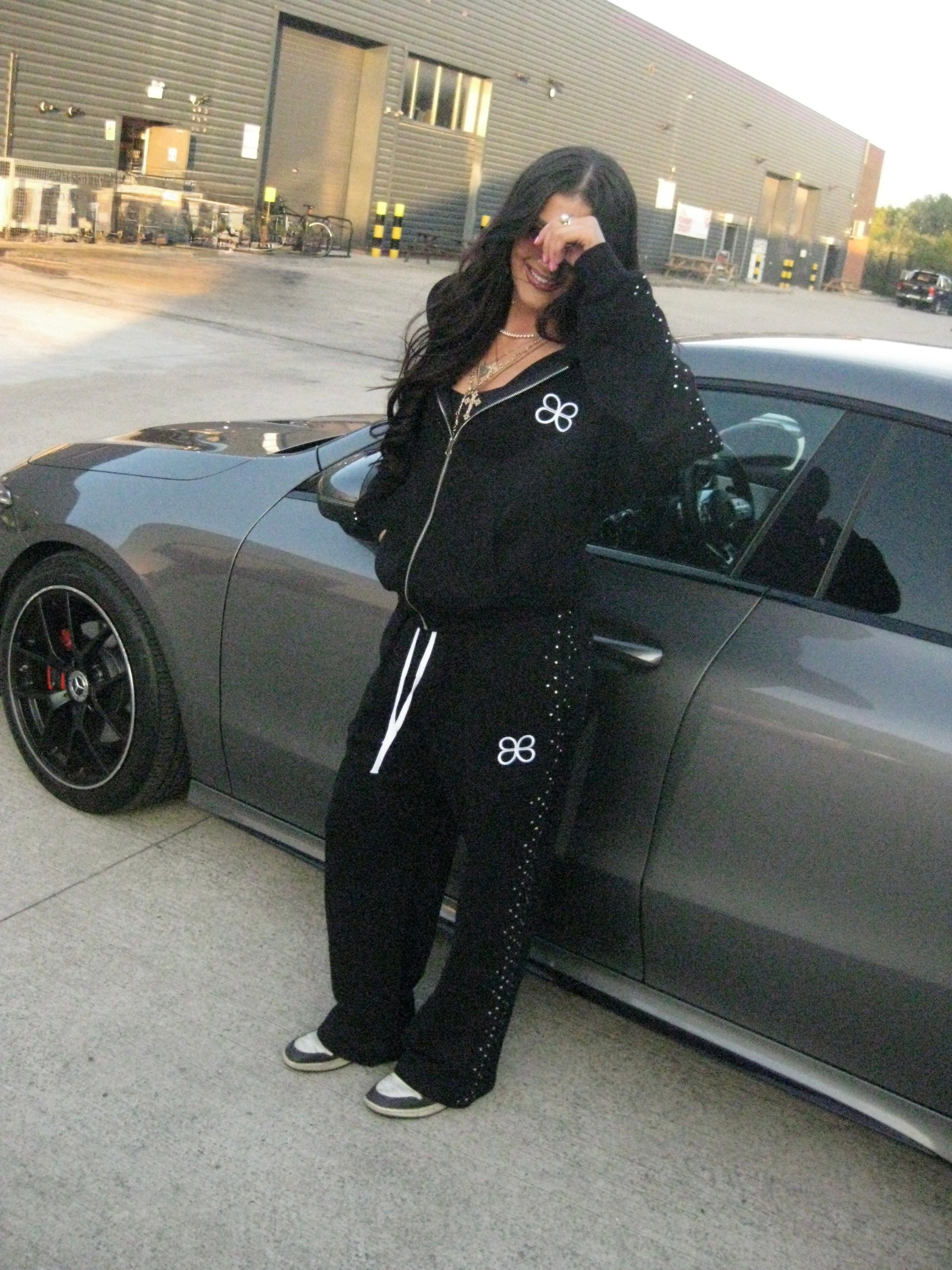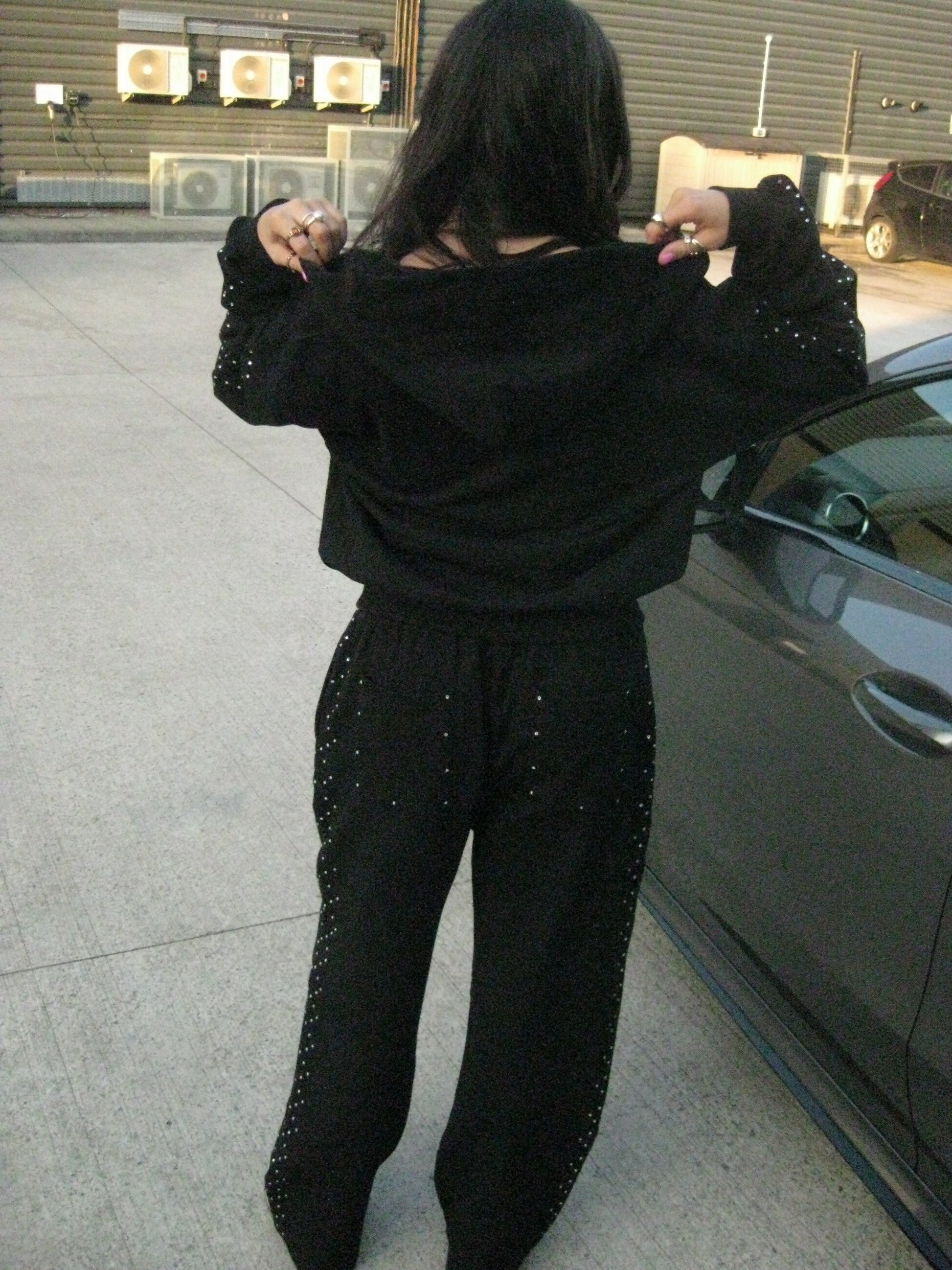Minimalistic unisex black tracksuit with rhinestone detail on sleeves , joggers sides and back pockets, No phrase at the back.